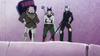 Meanwhile, there is another threat approaching, that being a Dark Guild, Succubus Eye, with Minerva revealed to be one of the members. Back at the Mages and Hunters, Hunters express their disagreement on Mages' help request due to the difficulty to obtain the Moon Drip. While running, Lucy wonders where is Erza, with Wendy telling her she stayed behind to look for clues. After a while of running, Hunters finally decide to fight against the persistent Mages. Lala initiates by using his Stronger on Natsu, with the latter dodging the attack. Natsu uses his Fire Dragon's Iron Fist as a counterattack but the fire gets extinguished easily by the good physical properties of Stronger. Lala then uses his weapon to throw Natsu in the ice and Gray is next to attack with his Ice-Make: Freeze Lancer. Standing against Hiroshi, Wendy and Lucy dodge the attack of his Chain Blade, which cuts a frozen tree instead. Concurrently, Drake, hiding from the sight of his enemies, uses his sniper to shoot Happy and Carla, who evade the initial shot. Finding out where Drake is hiding, Lucy summons Sagittarius, who uses his arrow to shoot the gunner but the latter breaks it with a precise bullet shot, impressing Lucy. Having a tough time beating them, Natsu concludes that Hunters are much tougher than they look.